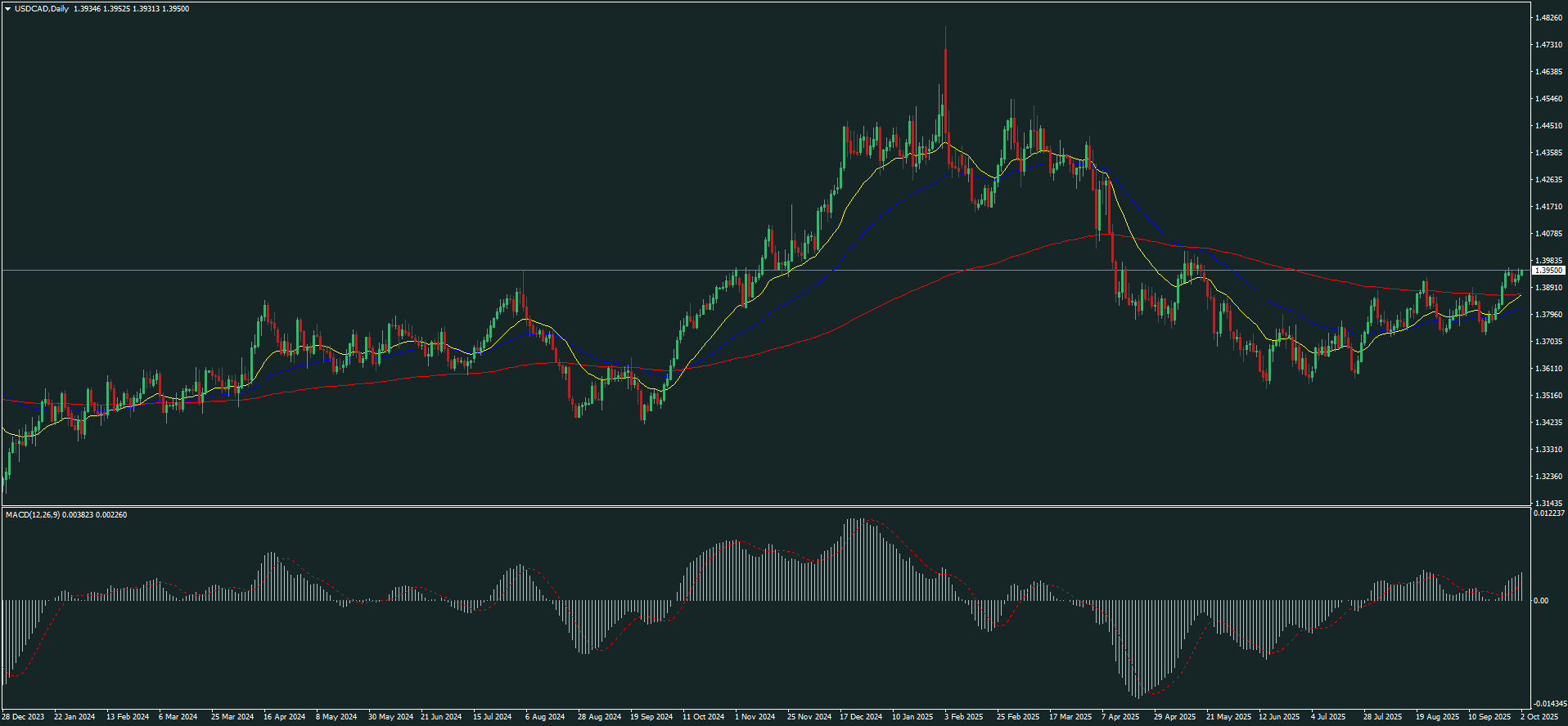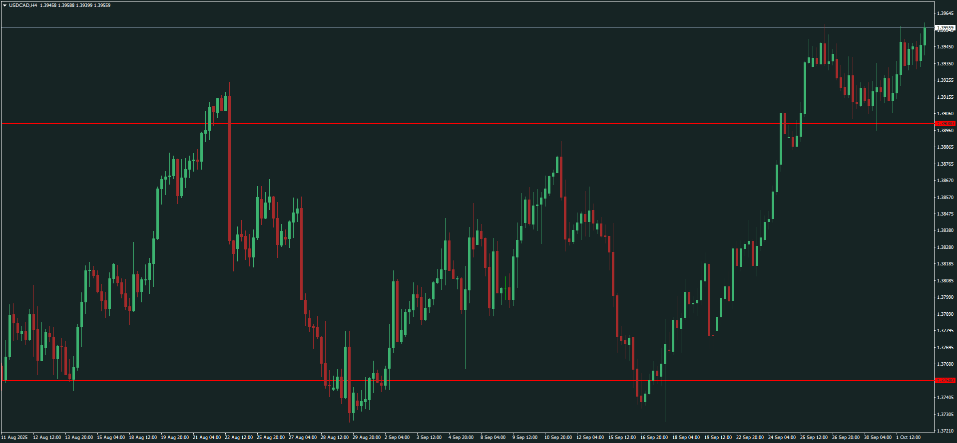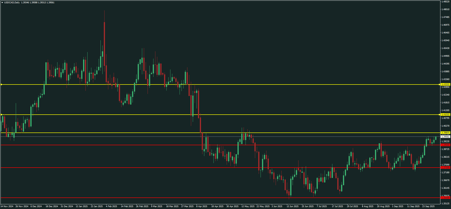 - Situación actual: USDCAD en zona crítica de resistencia en 1.3950 – 1.3980, tras un rally alcista desde septiembre.